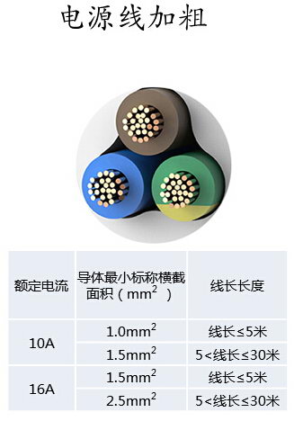 2.電源線加粗:額定電流10A的延長線插座,導線的最小橫截面積由原來的0.75平方毫米提高到1平方毫米;額定16A的則從1平方毫米提高到1.5平方毫米。提高了插座的承載能力,減少由于線纜過載引發的安全事故。